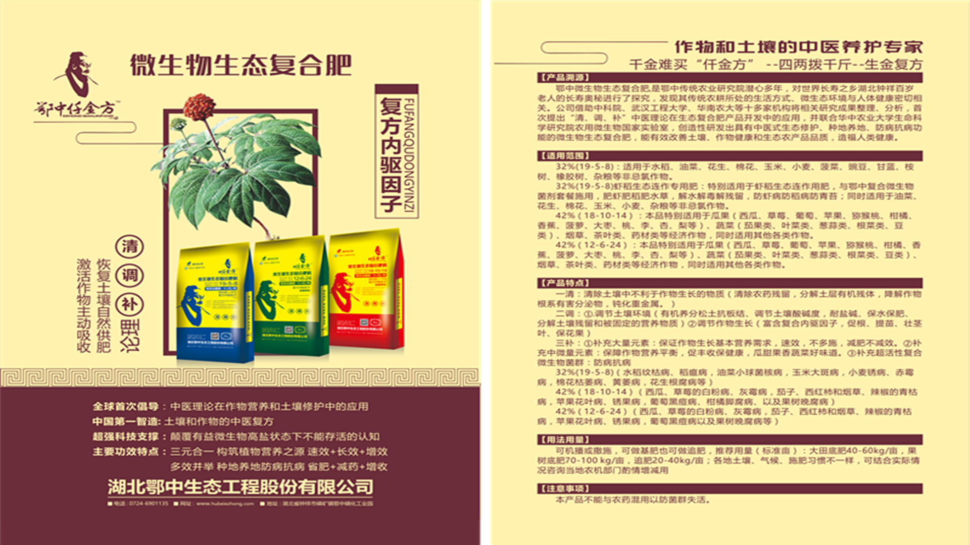 超强科技支撑的鄂中微生物生态复合肥系列命名“鄂中仟金方”并以“作物和土壤的中医养护专家”形象问世。鄂中仟金方正是遵循传统中医“清毒、和调、养正”的健康理论,融合多种功能性物质,复配成复方内驱因子,以整体性和系统性的中医规律恰当处理有机养分、无机养分、土壤微生物菌群的关系,创造性地提出了”一清、二调、三补“的作物和土壤的中医养护理论。一清:清除土壤中不利于作物生长的物质。鄂中仟金方能清除农药残留,分解土层有机残体,降解作物根系有害分泌物,钝化重金属。二调:一是调节土壤环境。鄂中仟金方所含的有机养分可松土、抗板结、调节土壤酸碱度,耐盐碱、保水保肥、分解土壤残留和被固定的营养物质;二是调节作物生长。鄂中仟金方富含复合内驱因子,可促根、提苗、壮茎叶、保花果。三补:一补大量元素。鄂中仟金方合理配比中低浓度NPK含量,能保证作物生长基本营养需求,速效,不多施,省肥不减效;二补中微量元素:鄂中仟金方添加多种螯合态中微量元素,可保障作物营养平衡,促丰收保健康,瓜甜果香蔬菜好味道;三补微生物及复方内驱活性物质:特别添加具有超活性复合微生物菌群,具有耐高温、耐高盐、500天超长生命力的特点,能激活土壤中沉积的养分,大幅提升肥料利用率;促进作物生长,增强抗逆能力;改善农产品品质;显著起到省肥、减药、增效的作用。
