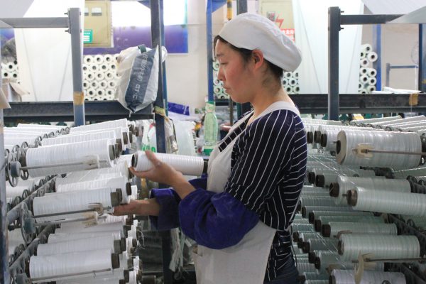 —圆织生产实行目检和手检结合,要求每5cm内经纬线密度误差不超过1根的严苛标准,保证织布平整。在整卷织布入仓贮存前,还要袋面取样做拉力检测,保证扁丝未发生其他变化,影响织布质量。