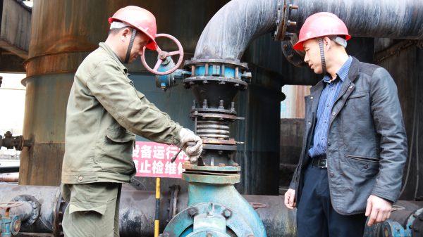 宜昌公司副经理王雪峰(左)与总工彭亮(中)、磷铵厂厂长蒋庆元在磷铵厂现场商讨技改方案