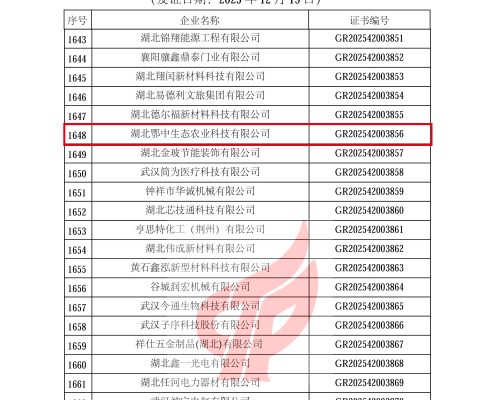 近日,全国高新技术认定管理工作领导小组办公室公布湖北省第三批高新技术企业认定名单,湖北鄂中农业科技有限公司成功入